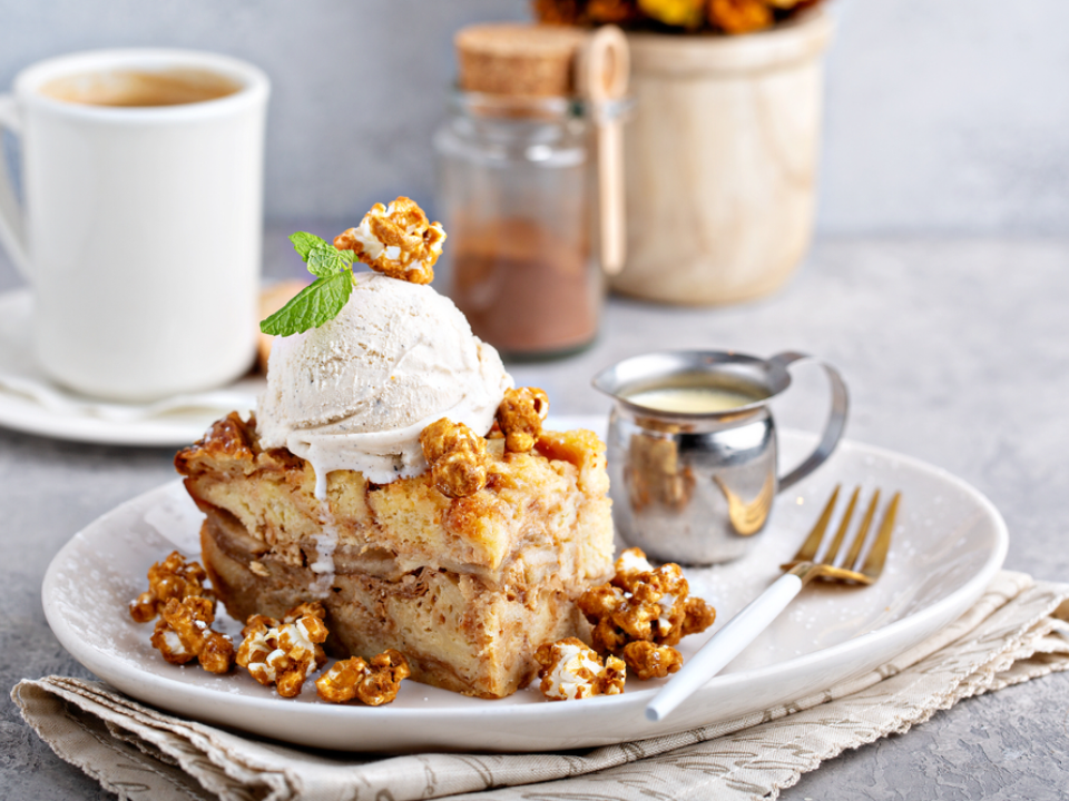 For the pudding, mix 3 cups cubed bread, 2 cups milk, 2 eggs, quarter cup sugar, and 1 teaspoon vanilla. Bake at 350°F for 30 minutes until set. For the latte, combine half cup strong coffee, 1 cup steamed milk, and 2 tablespoons caramel sauce. Stir well and serve hot.
