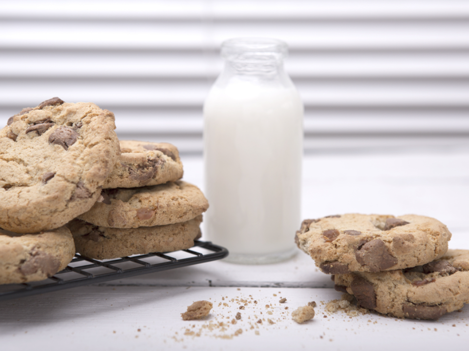 For the cookies, mix half cup butter, three quarters cup sugar, 1 egg, 1 cup flour, 2 tablespoons malted milk powder, and 2 tablespoons cocoa powder. Bake at 350°F for 11 minutes. For the drink, heat 2 cups milk with 2 tablespoons malted milk powder. Stir until smooth and hot. Serve immediately. Cookies cool quickly.