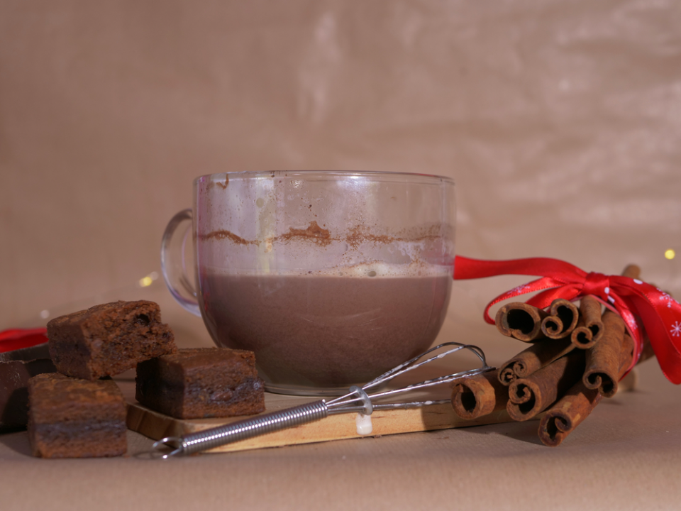 For the brownies, mix 1 cup melted butter, 2 cups sugar, 4 eggs, 1 cup cocoa powder, 1 cup flour, and 1 teaspoon salt. Pour into a greased pan and bake at 350°F for 25 minutes. For the drink, heat 2 cups milk with 2 tablespoons cocoa powder, 2 tablespoons sugar, and one quarter teaspoon cinnamon. Stir until smooth and hot without boiling. Serve both warm for the best texture. The brownies can be made ahead and rewarmed gently.