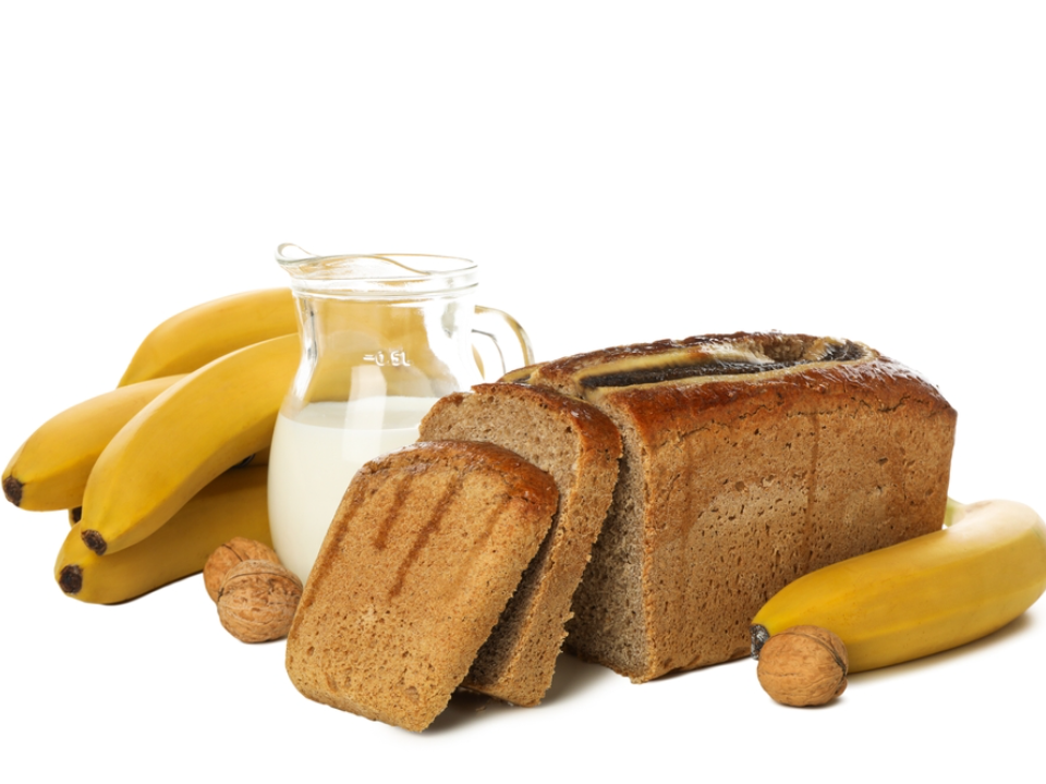 For the bread, mix 2 ripe bananas, half cup butter, three quarters cup sugar, 1 egg, 1 and a half cups flour, and 1 teaspoon baking soda. Bake at 350°F for 50 minutes. For the drink, heat 2 cups milk and blend with half mashed banana and a little sugar. Heat gently before serving. Slice bread once cooled.