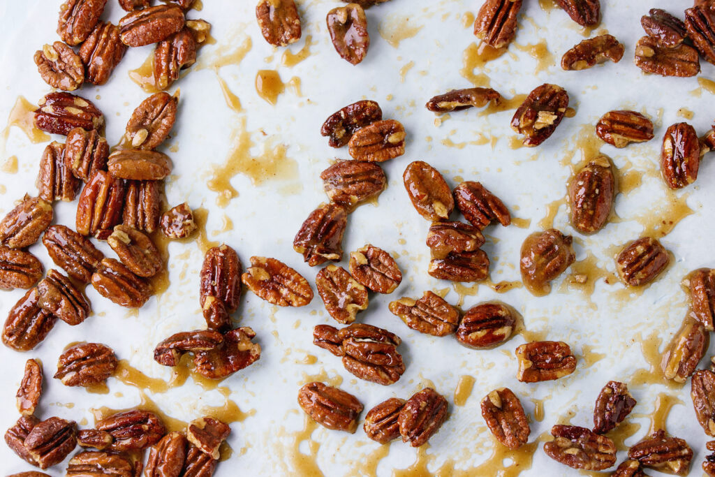 These nuts mimic the flavor of pecan pie in bite-sized form. Butter and brown sugar caramelize into a rich coating, with a splash of bourbon or vanilla for depth.