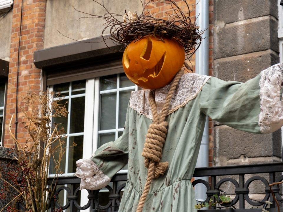 A scarecrow pumpkin is a creative way to combine two Halloween staples. Start with a pumpkin and add a burlap sack or old shirt to create a simple scarecrow body. Attach a carved pumpkin or gourd for the head and place it on your porch or in a chair to welcome your guests.