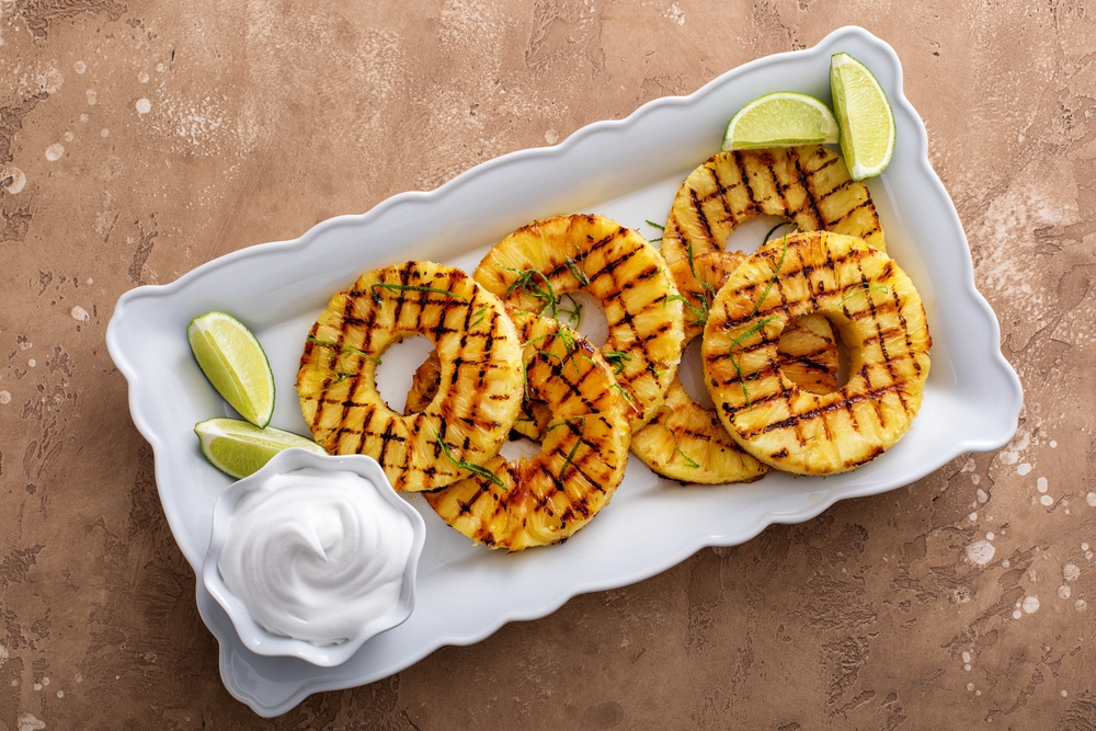 Cut 1 fresh pineapple into slices and brush with 1 tablespoon of honey and 1 teaspoon of lime juice. Place the pineapple slices on the grill and cook for 3-4 minutes per side until grill marks appear and the fruit softens. Serve as a side dish or dessert, garnished with fresh mint for an extra burst of flavor.