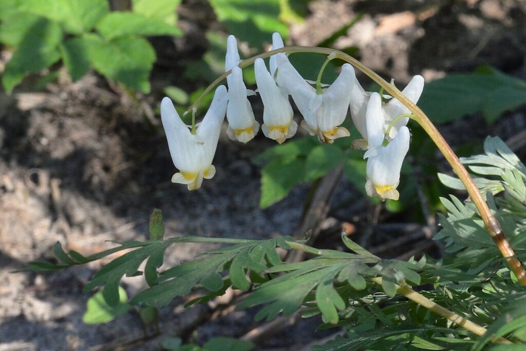 The leaves are finely cut and soft-looking, which gives the whole plant a delicate appearance. Despite that delicate look, a healthy patch can be quite noticeable once it starts blooming. This is the kind of flower that makes people stop and take a second look because the shape is so unusual. A shaded trail with mature trees is your best chance of spotting it.