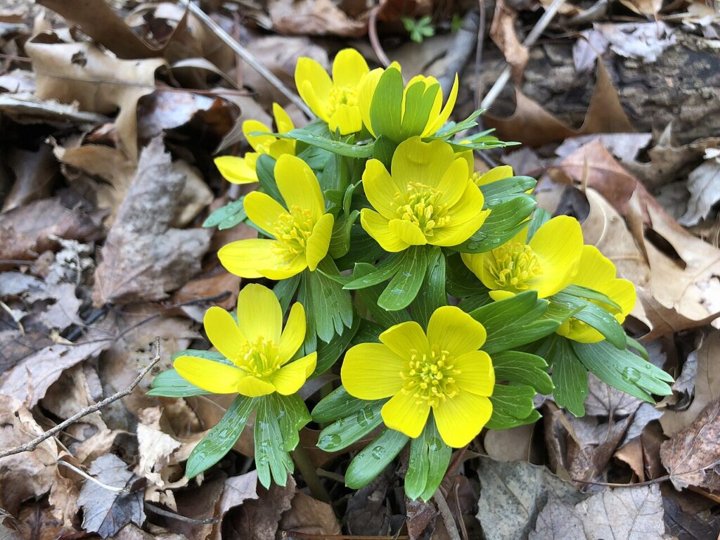 Winter aconite has cheerful yellow flowers that look almost like tiny buttercups. The blooms sit above a ruff of green leaves, which gives each flower a neat, tidy look. In early March, they can appear in small carpets under trees where sunlight reaches the ground before the canopy fills in. Their bright color is easy to spot even when the rest of the scene still looks muted.