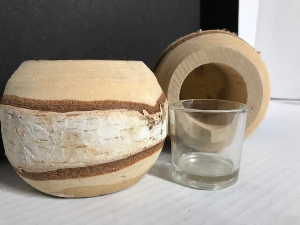 This holder is fashioned from a short section of birch bark rolled and sealed to hold a small candle cup inside. The natural peeling texture of bark gives an organic feel that echoes forests in winter months. Light within warms the bark slightly creating a soft contrast between dark interior and pale bark exterior.