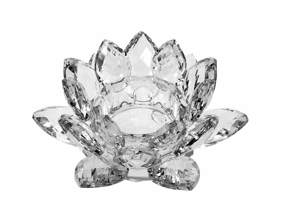 This holder uses clear faceted glass or crystal shaped to evoke ice shards or icicles. When a tea light is lit inside the glass facets catch the light and scatter tiny reflections around the space. The result feels like light glinting off snow and ice on a cold night.