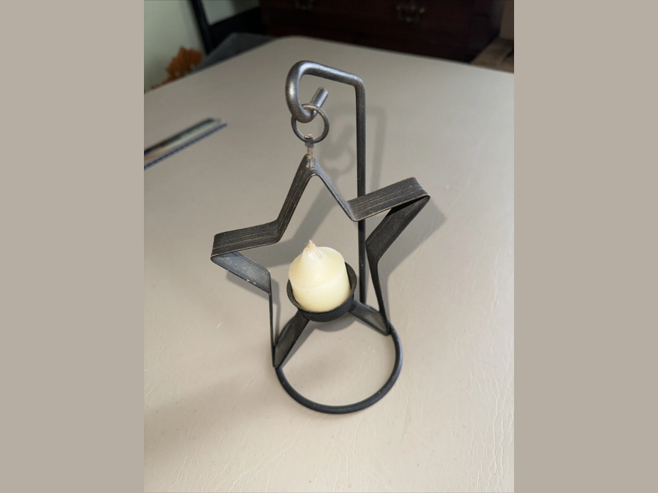 This piece consists of thin metal bars arranged in a star shape that surrounds a small jar or votive candle holder inside. The metal has a slightly worn finish giving a hint of vintage metalwork charm. When lit the cage casts star-shaped shadows outward and adds a subtle pattern of light and dark on nearby surfaces.