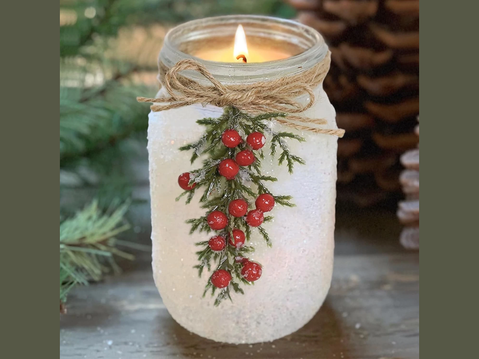 This idea repurposes a clean glass mason jar into a candle holder by placing a small candle or tealight inside and surrounding it with faux snow, small pine needles, or small dried berries. The glass amplifies the glow and the natural or seasonal fillers inside create a winter village effect when light flickers inside. The jar edge helps contain any wax drips and makes it easy to move or reposition.