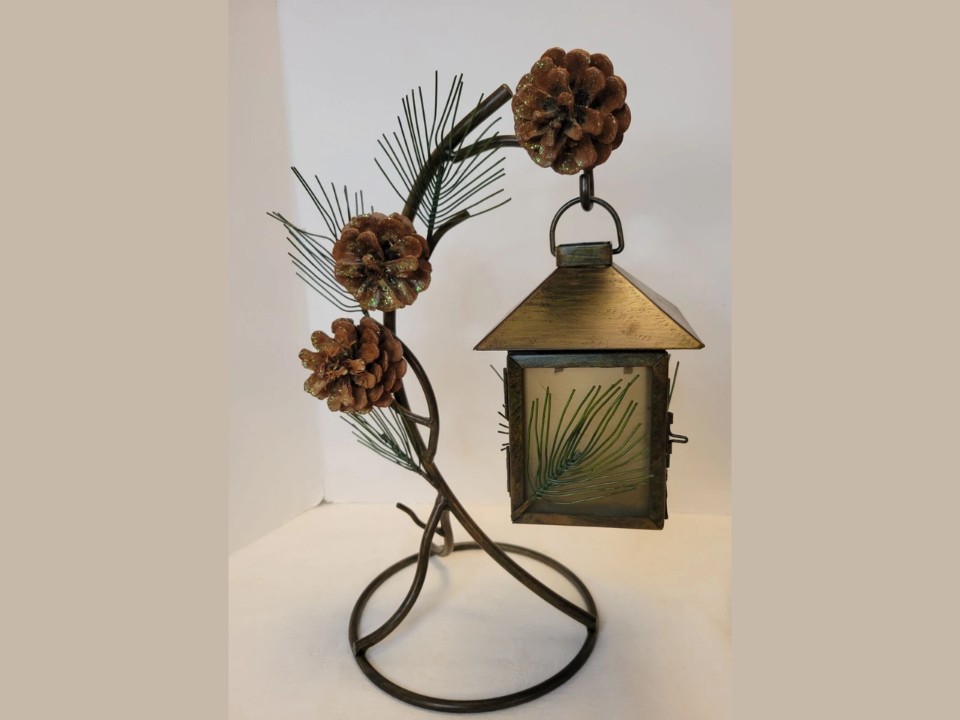 This candle holder is shaped like a small lantern with metal mesh panels filled with small pinecones inside. When a candle burns within it the light glows softly through the gaps around the pinecones creating warm shadows that remind one of a forest floor in winter. The pinecone texture brings a natural and earthy presence to a mantel or a wooden shelf.