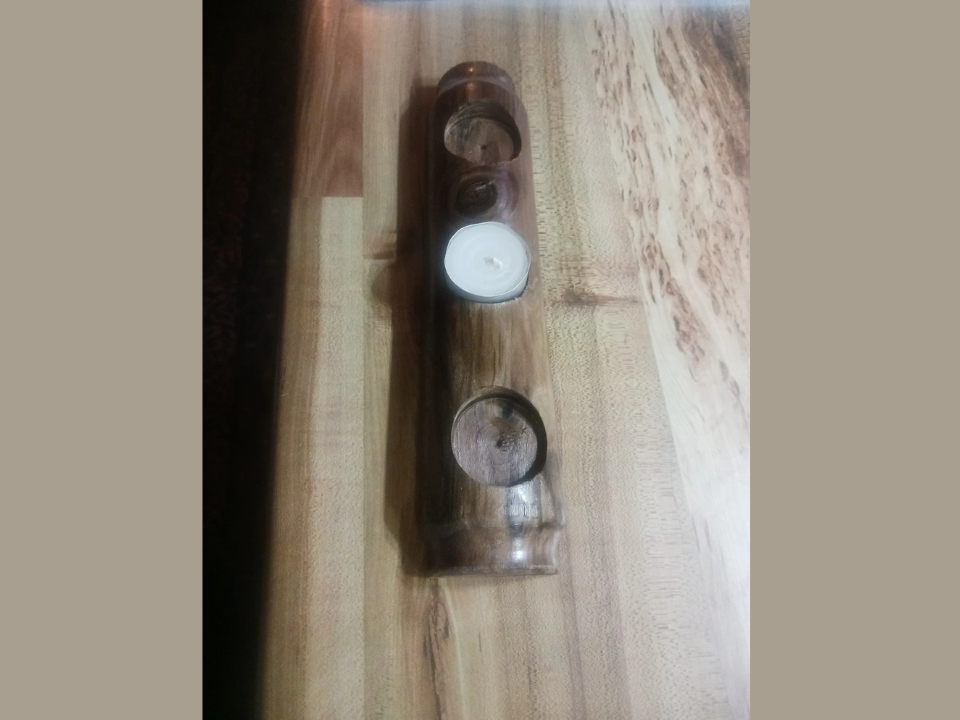 This holder consists of a flat slab of untreated wood long enough to hold one or more thick pillar candles side by side. The natural grain of the wood gives an organic warmth that complements winter themes. When candles burn they reflect softly off the wood surface and mingle with the warm tones of the material.